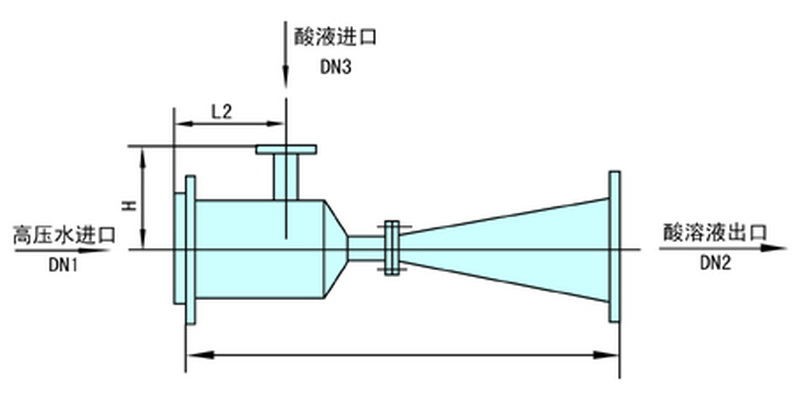 高壓原水通過管道閥門進入噴射器的漸縮段,將靜壓頭轉(zhuǎn)換成動能,在噴嘴處成為高速射流,使混合室形成微真空狀態(tài),將高濃度的再生藥液吸入混合室,并使再生藥液的壓力和速度發(fā)生變化;在混合段內(nèi),水和藥液得到充分地混合,然后注經(jīng)擴散段,使再生液減低流速,靜壓頭升高,再通過出口管道及閥門將稀再生液送到交換器本體中。